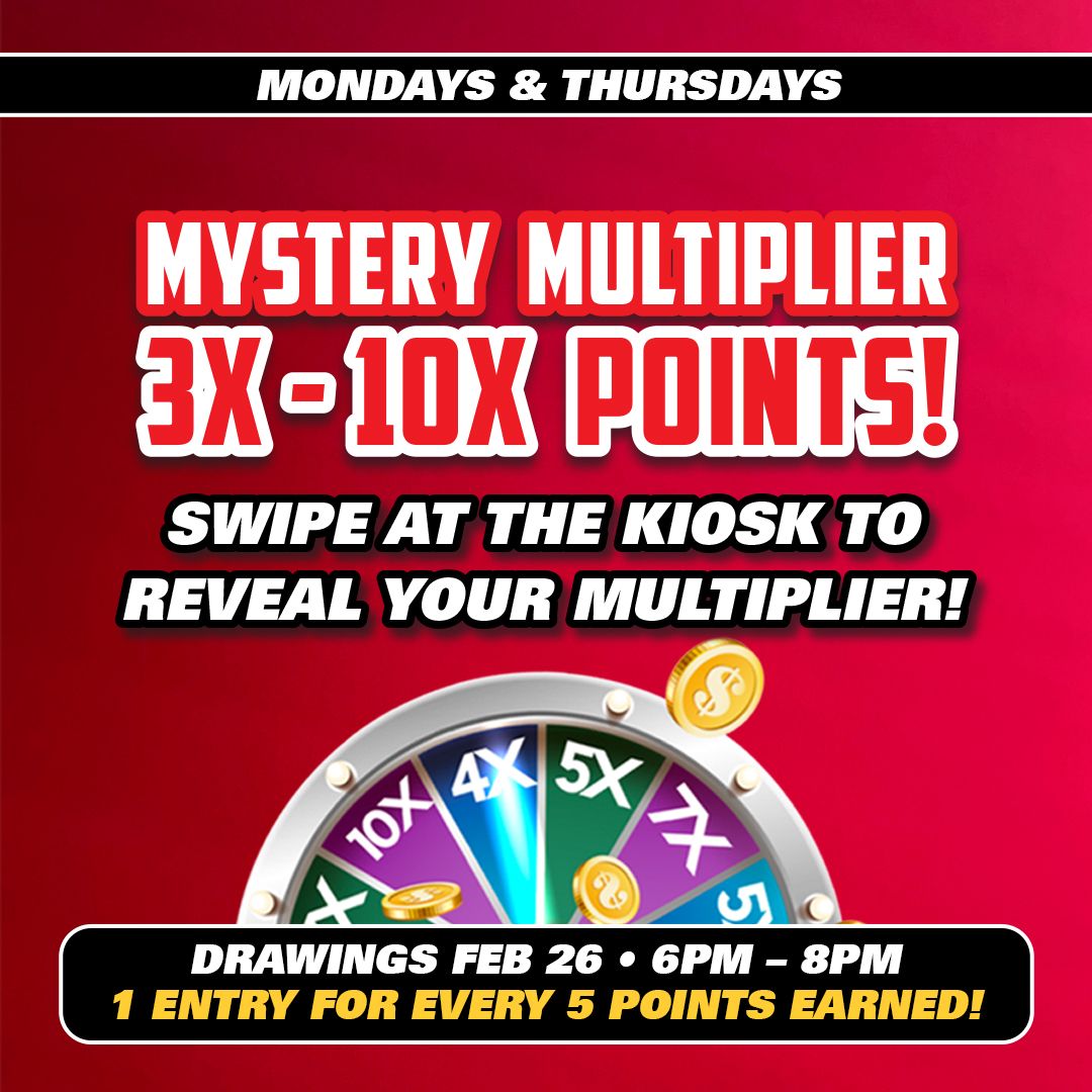 Swipe at the promo kiosk on Mondays & Thursdays to multiply your points up to 10X!