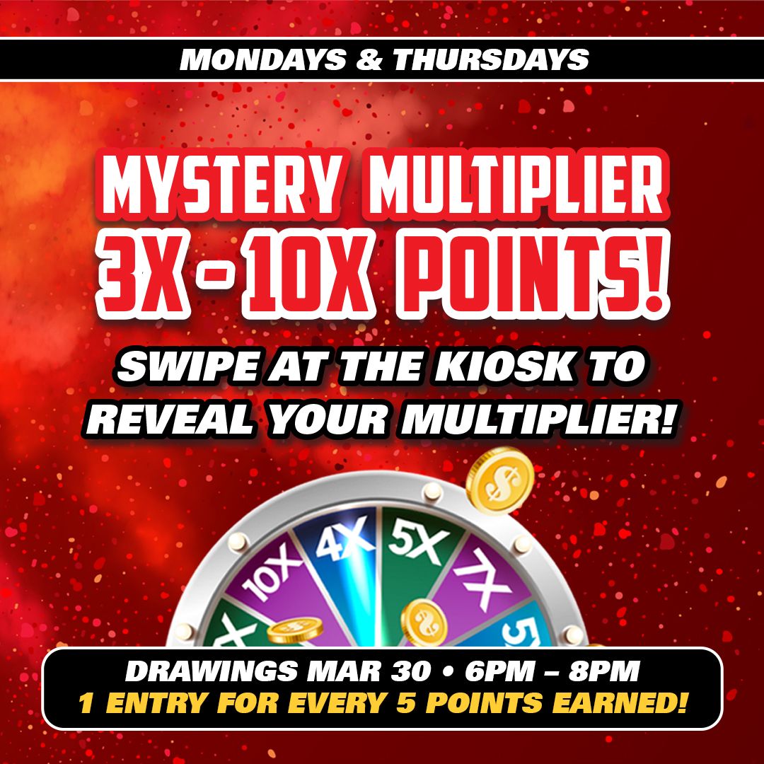 Win Cash, Free Play, Food Vouchers, Gift Cards or up to a 10x Multiplier!